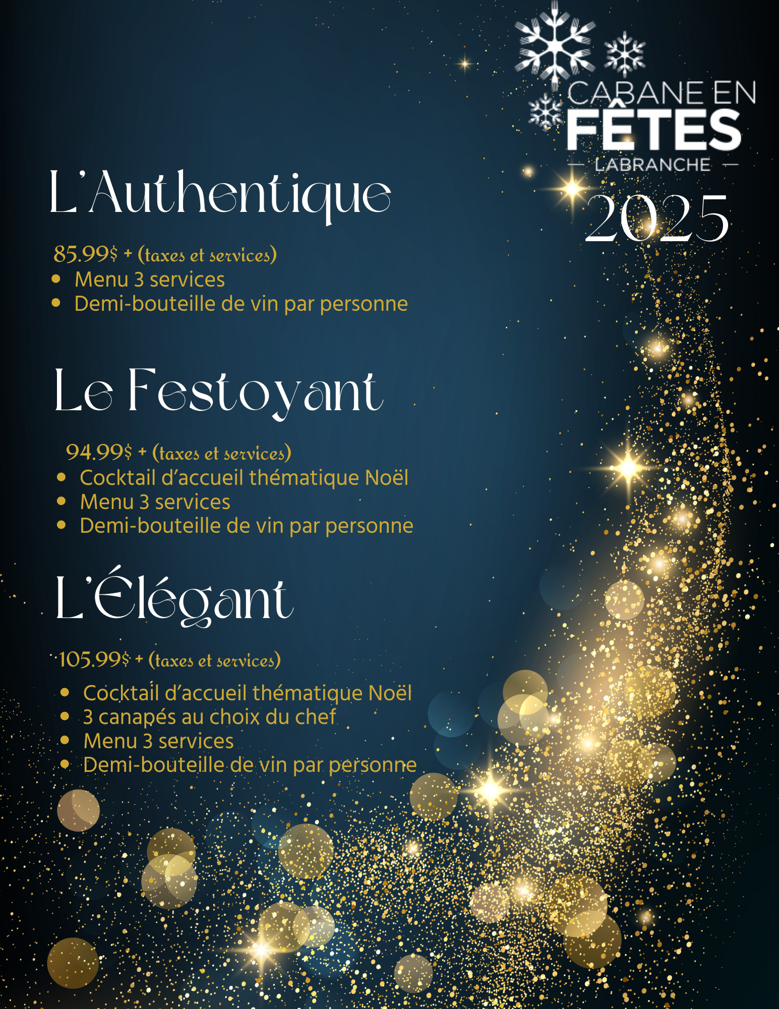 Nous sommes ravis de vous présenter nos trois forfaits festifs spécialement conçus pour célébrer Noël dans un cadre chaleureux et élégant.