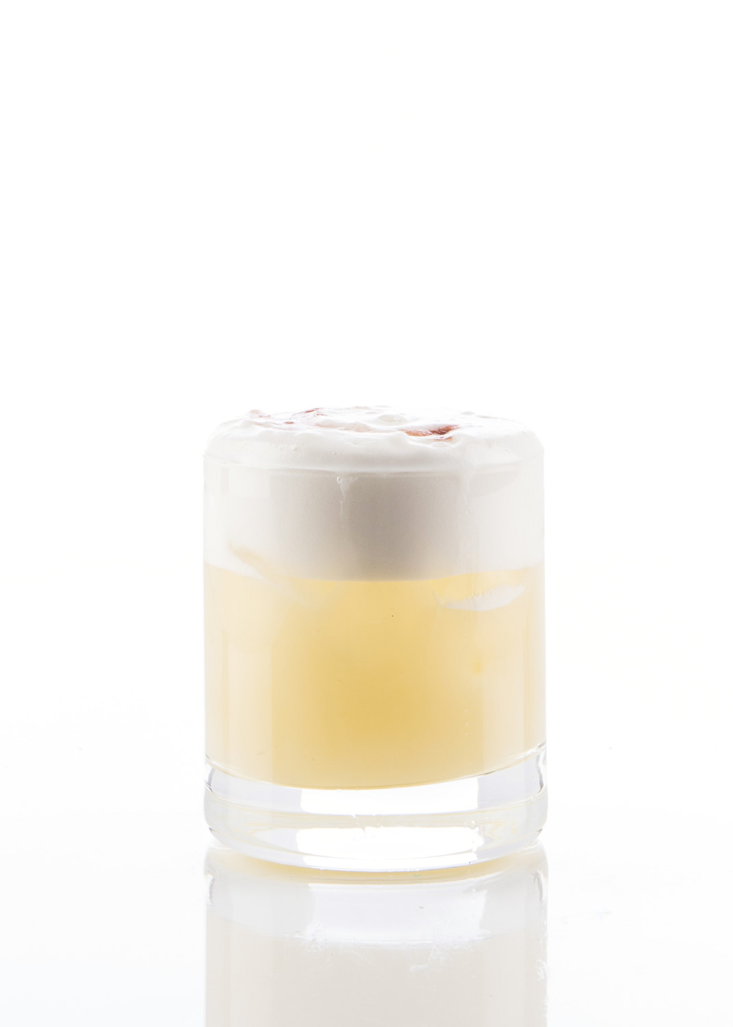 Add the simple syrup, lemon juice, sweet maple wine and egg whites in a mixing glass. Stir vigorously and strain the mixture through a cocktail strainer into an old fashioned glass filled with ice. Finish with Angostura bitters.