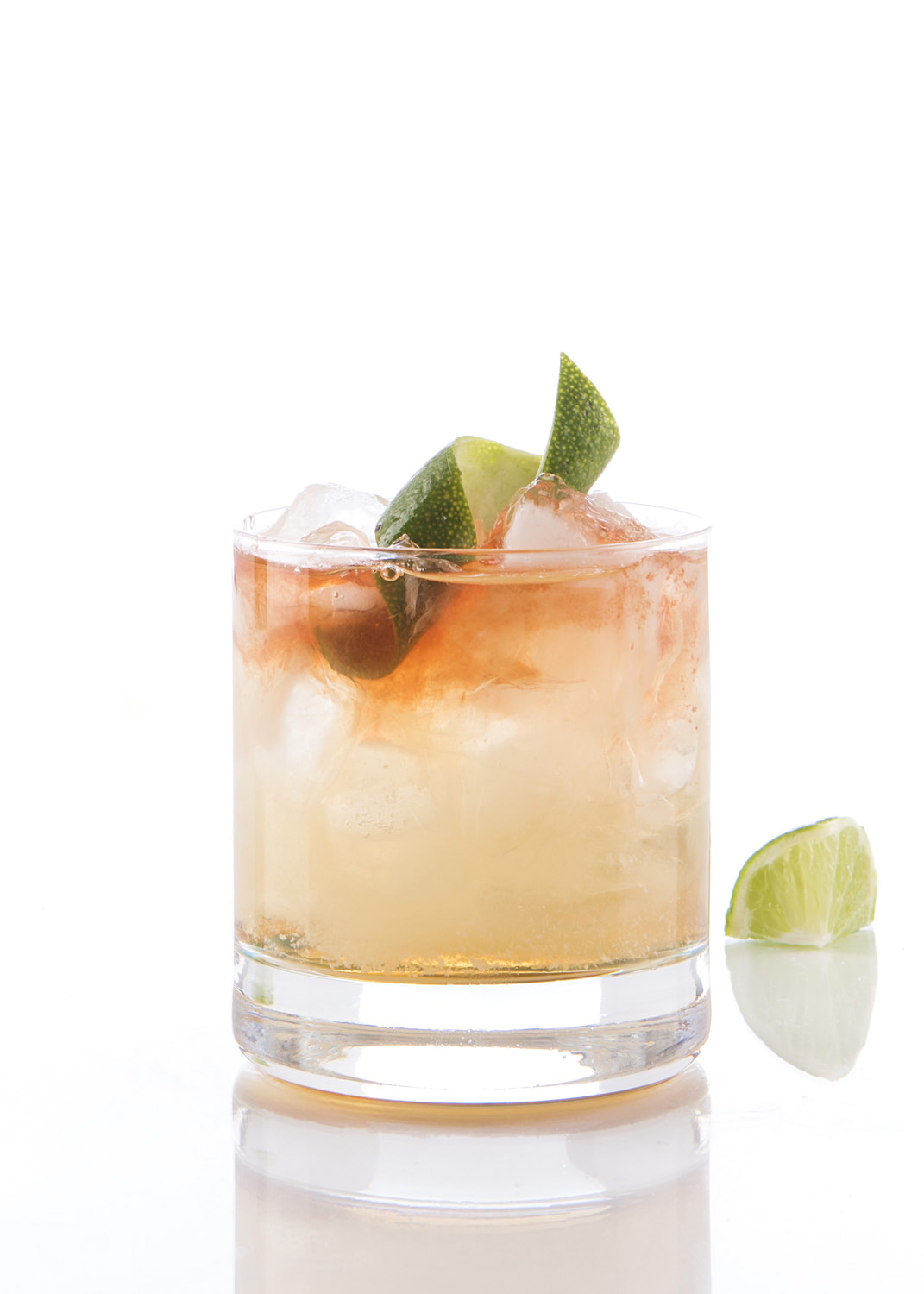 In a glass old fashioned glass with ice cubes, add the maple wine, maple syrup, lime juice, tonic water and bitters.