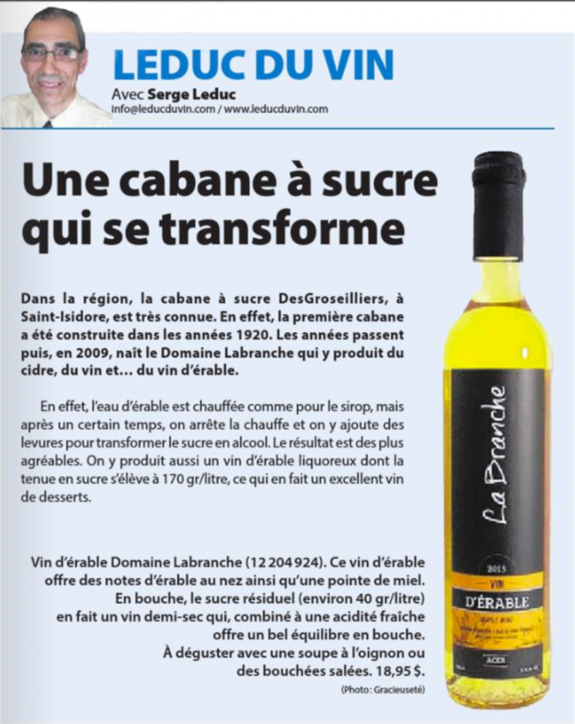 … »Le Domaine Labranche, c’est d’abord la cabane à sucre de la famille Desgroseilliers, construite à proximité de Saint-Isidore, en Montérégie et qui date de la première moitié du XXe siècle. C’est à partir de 2009 que Le Domaine Labranche se développe, au-delà de l’érablière, en une cidrerie et un vignoble, le tout alimenté par l’esprit ‘’d’entrepreneuship’’ de la nouvelle génération de Desgroseilliers composée de 6 enfants. Ainsi, les produits du Domaine Labranche sont conçus dans cet esprit familial où tous et chacun participent à l’élaboration de produit de qualité tant au niveau maraîcher, pomiculture que du vignoble. (…) » POUR LIRE L’ARTICLE AU COMPLET CLIQUEZ ICI