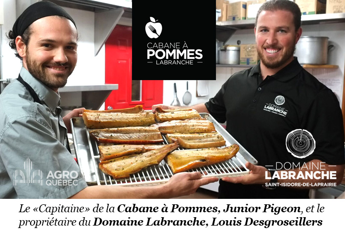 »Nous avons pu rencontrer Louis Desgroseillers, qui s’occupe du volet agrotouristique et de la restauration au Domaine Labranche. C’est que le domaine veut diversifier ses activités pour offrir des expériences culinaires comme la cabane à pommes. Le principe est un peu le même que la cabane à sucre, mais c’est l’ingrédient central qui change : au lieu du sirop d’érable, ici c’est la pomme qui règne.